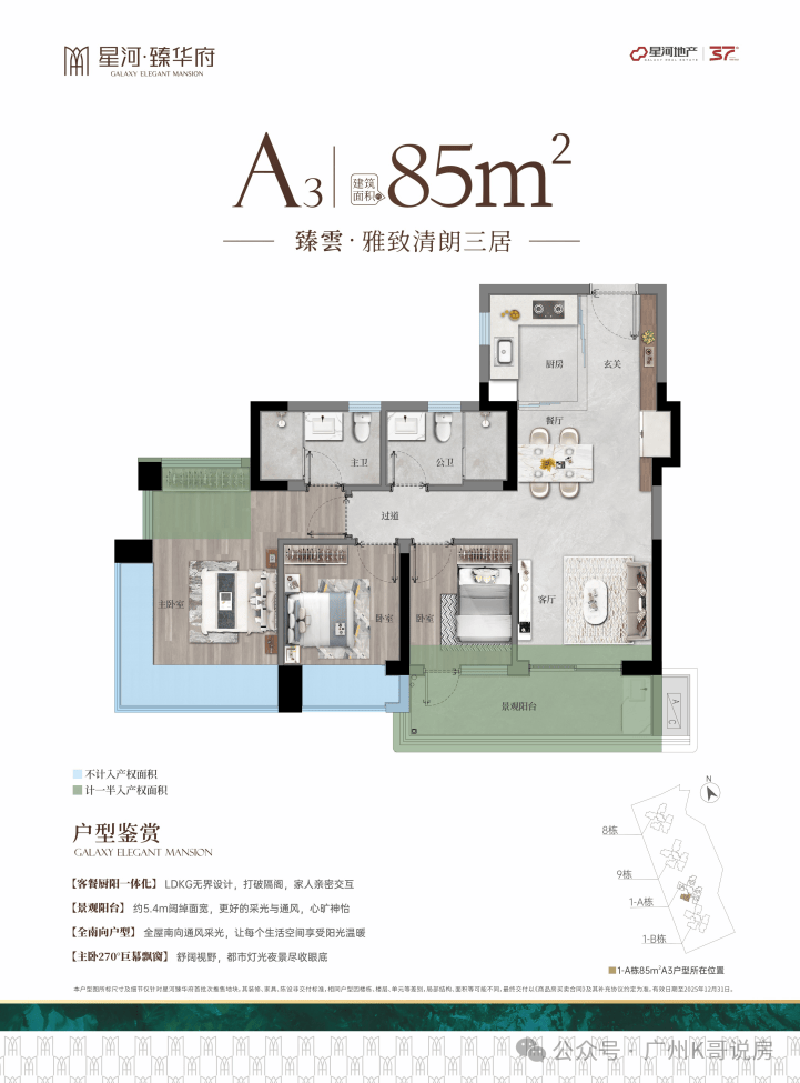 约85㎡三房,有三个户型,A2、A3户型,能做到客厅+三个卧室朝南;A4户型,则是南北对流设计。