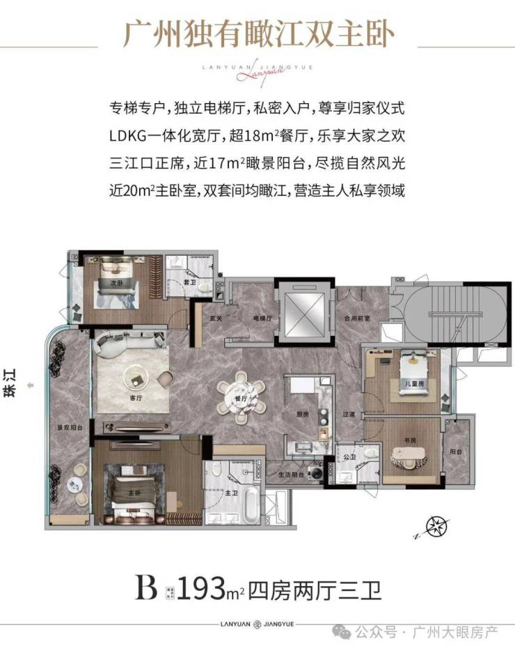 体量不大,项目只规划了一栋楼,18层高,全盘只有68套,而且只做了两种户型:193㎡和285㎡江景大平层。