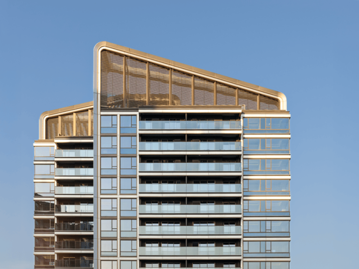 建筑立面以现代简约的玻璃与铝板,勾勒出鎏光镜面的挺拔轮廓。细节处,则从广府「满洲窗」与「叠山纹」中提炼弧线元素,让建筑兼具国际风范与在地文脉。