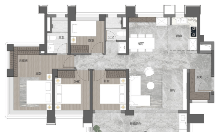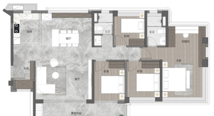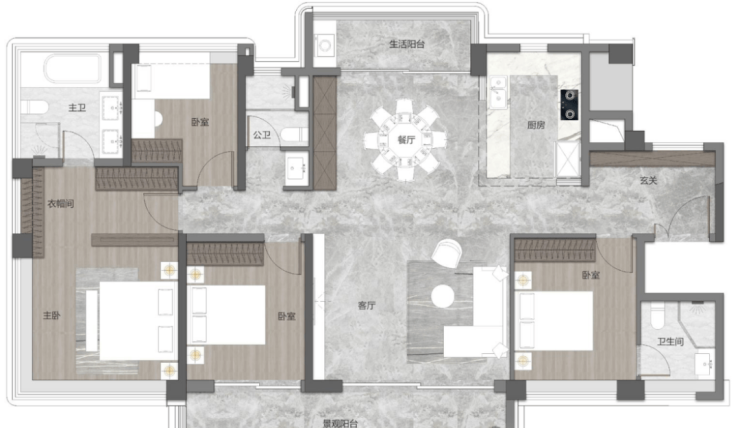 138㎡四房户型,做到了四开间朝南,约16.6米大面宽,而且餐厅带飘窗,做到了南北对流,主卧还配置了独立衣帽间和超大收纳柜,很适合二胎家庭居住。