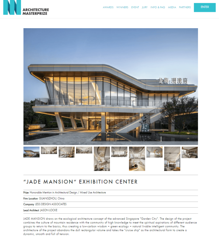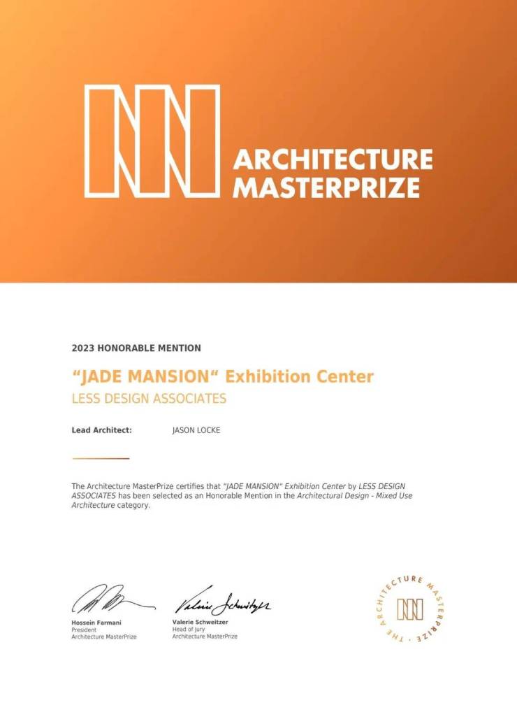 LESS DESIGN work 『“JADE MANSION”EXHIBITION CENTER』 project won the honorable mention of the 2023 ARCHITECTURE MASTERPRIZE - Architectural Design / Mixed Use Architecture.