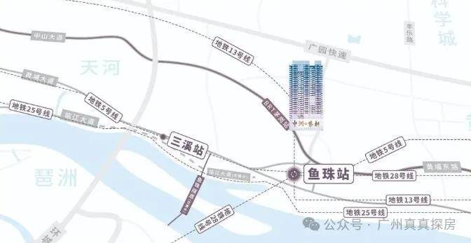 项目位于中山大道、黄埔大道交汇处,距离鱼珠地铁站C口大概700米,属于步行可达距离。而鱼珠站是地铁5号线和13号线的转乘站,可以快速抵达天河区、黄埔区和增城区,距离珠江新城站也只有8站。