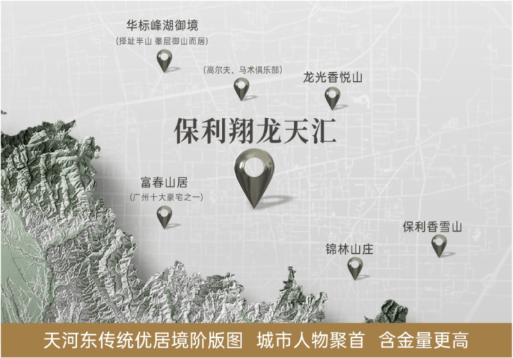 自带宜居基因,片区著名住宅、场所、资源汇聚。与城市精英为邻,周边均为改善优居聚集:华标峰湖御境、龙光香悦山、雅居乐富春山居,尊享精神余裕,马术俱乐部、高尔夫俱乐部在旁,为人居进阶而生。