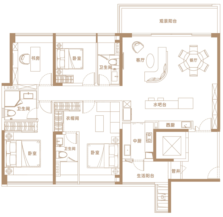 ✨【141㎡户型】南北对流双阳台四开间朝南,约1.8m*6.6m瞰江阳台,客餐厅无梁一体化,享双主卧套间宽阔私密空间。