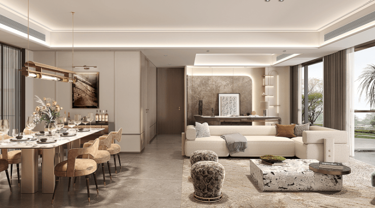其中,142㎡户型样板间深度践行这一理念,以优雅艺术为核心,巧妙平衡传统与现代。设计既保留岭南风格的典雅韵味,又融入现代摩登元素,将艺术设计理念渗透到家居空间的每个角落,实现了复古与现代艺术理念的完美统一。