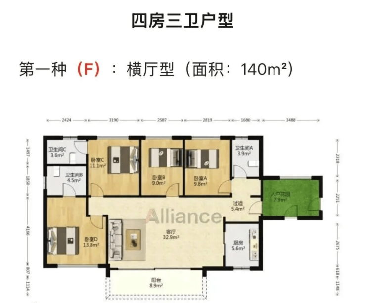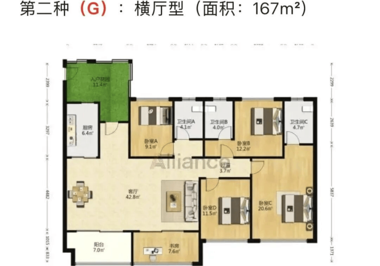 四房三厅三卫:面积约为140-167平方米,横厅型布局,空间开阔,主卧套房设计,配备独立衣帽间和卫生间,居住舒适度高。