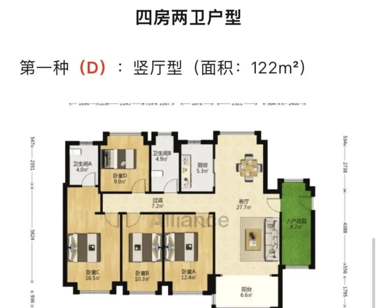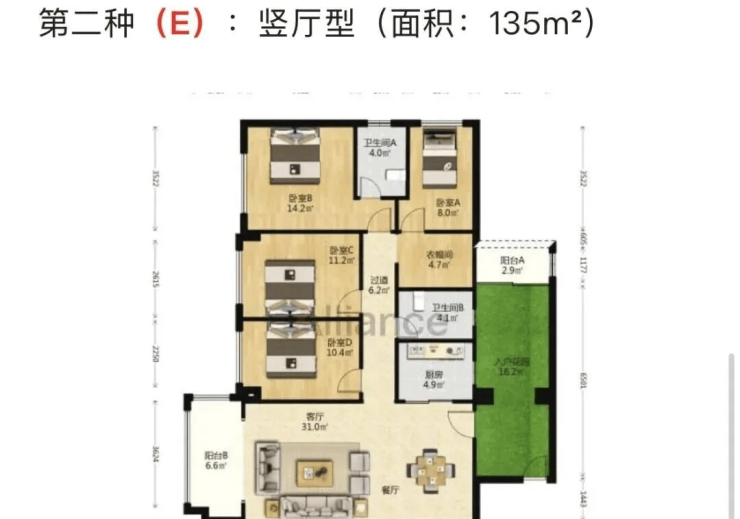 四房两厅两卫:面积约为122-135平方米,竖厅型设计,功能分区明确,适合改善型家庭居住。
