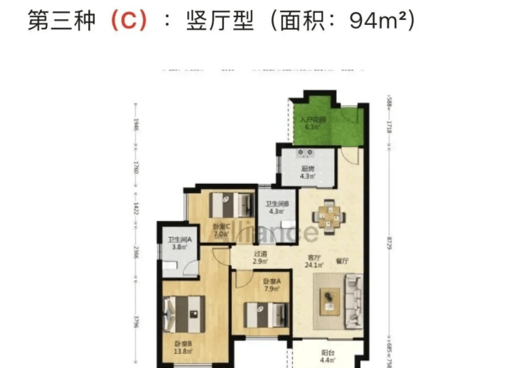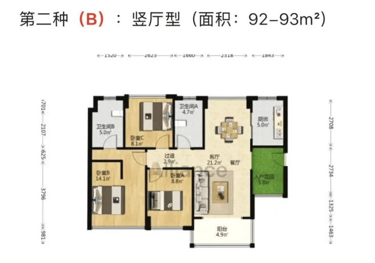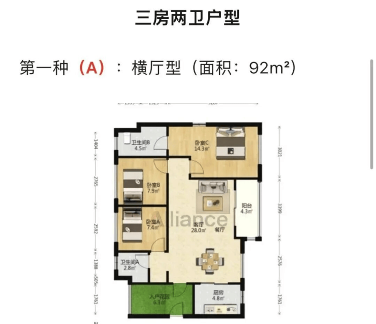 三房两厅两卫:面积约为92-94平方米,包括横厅型和竖厅型,部分户型带入户花园,空间布局合理,采光通风良好。