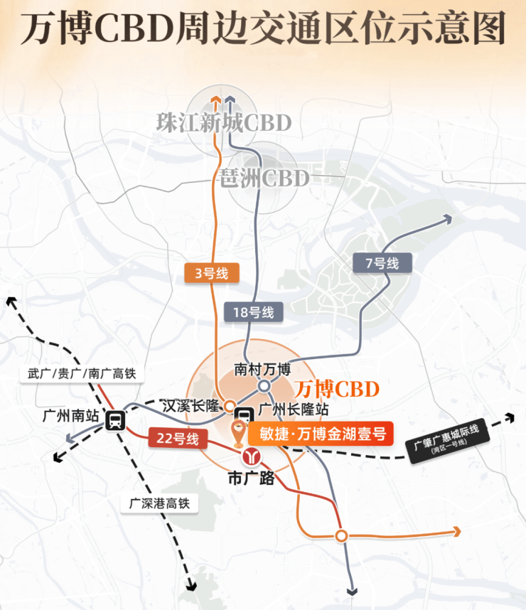 出门约800米即达22号线地铁市广路站(百度地图直线距离),1站番禺广场、2站万博中心、3站琶洲CBD、4站珠江新城;规划中26号线更是潜力可期。