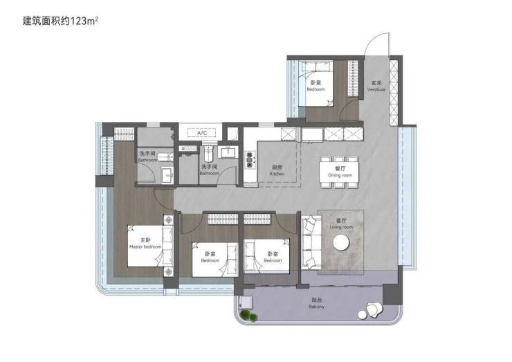 123㎡创意四房两卫,约15.9m奢阔采光面,南北通透大开间,时刻享受阳光与鲜氧