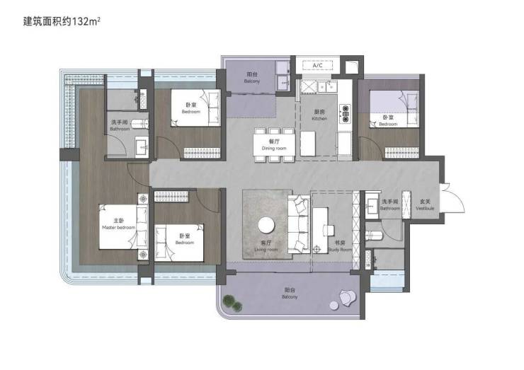 132㎡创意四房两卫,西南向,超50㎡大方厅,格局大气阔绰通透