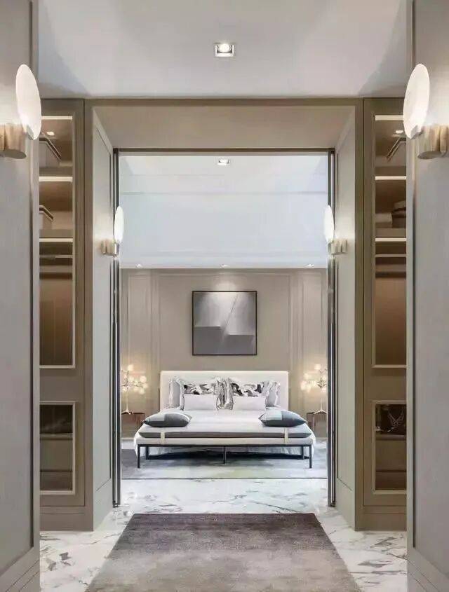 左右各有超大的步入式衣帽间,廊道上铺设星光红毯,走到尽头才是睡眠区。