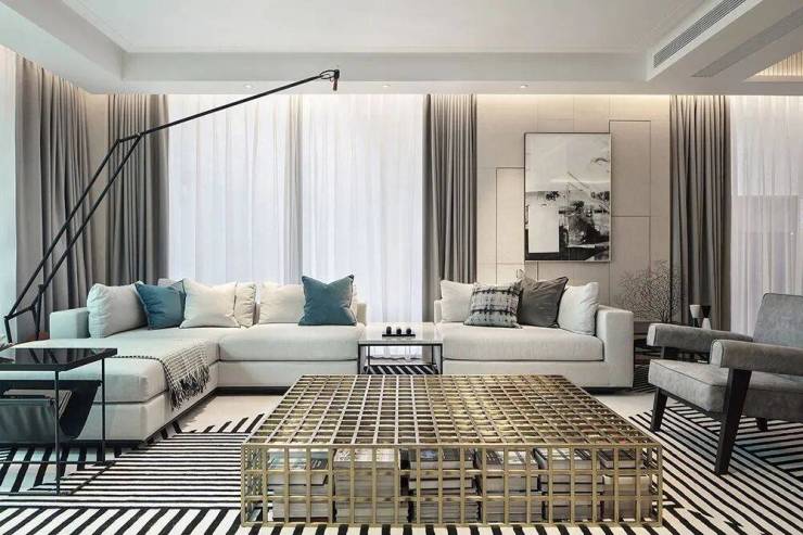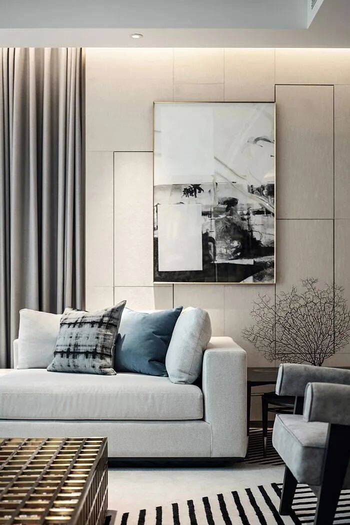 以高级灰为主调,造型简约的家具,地毯、茶几的极简线条经纬交错其中,于雅致空间内勾勒出时尚感。