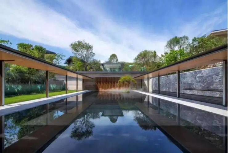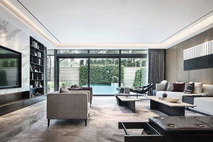 会客厅呈开放式设计,简约线条勾勒出场域的大气之感,富有质感的材料低调中透出精致与奢华,透过玻璃门视觉延伸到配有露天泳池的庭院。