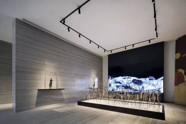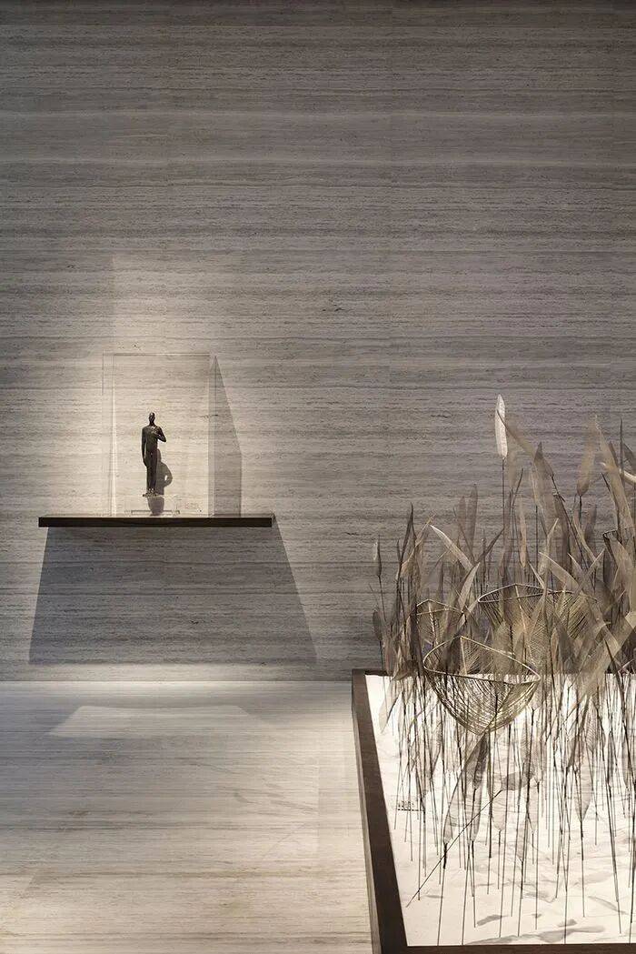 木纹大理石从墙面蔓延到地面,形塑风格,以空间的纯粹性凸显展区内容。