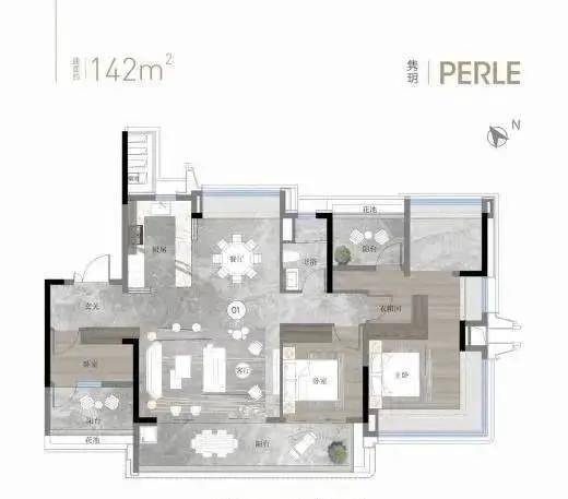 建面约142平方米户型:货量最多,独梯独户板式设计,三面采光,餐客厅和主卧南北对流。