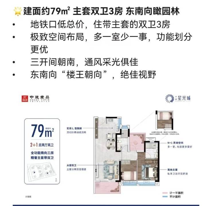 产品:项目总体南低北高,保证日照需求,蝶形设计,保证户户朝南,围合式布局,保证户户望园林。中建星光城分两期建设,目前在售69㎡-100㎡户型。
