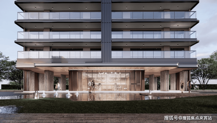 多层洋房正立面展现出水平方向的清晰结构,阳台界面以玻璃为主材,在自然光线下,透明介质弱化空间边界,消解多层的体量感,使建筑显得轻盈而优雅。古铜色金属线条纤细、清晰,搭配着浅灰色石材,为水平结构线增添视觉层次。建筑外墙材料采用灰色石材结合深灰色铝型材,辅以暖调的古铜色铝型材,细节丰富而和谐。