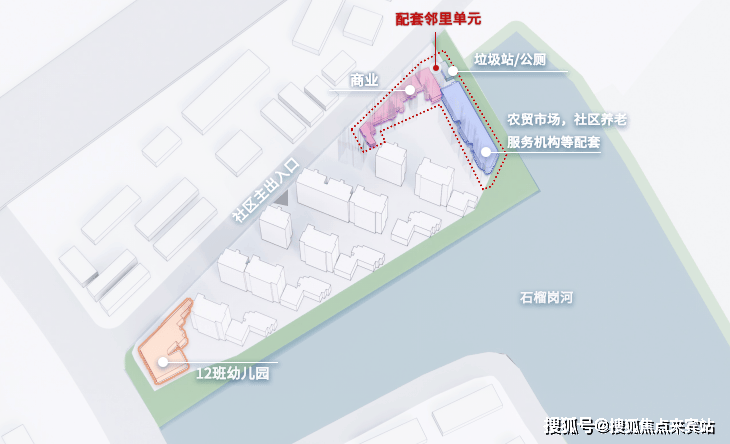 在城市东北处街角设置配套邻里单元,植入社区服务、文化娱乐、老年活动、商业购物等功能,形成一体化的配套共享空间,承载都市生活。漫步于河畔,城市的繁华和自然的宁静尽在咫尺之间。