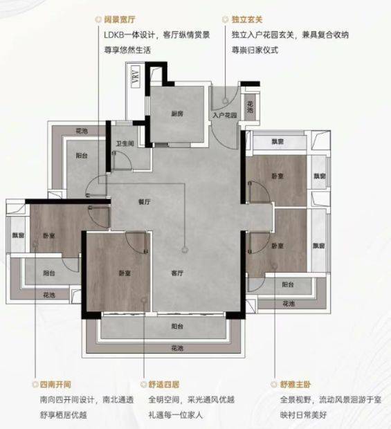 建面约102㎡“飞机户型”四房:经典的飞机户型设计,四个房间分布于客厅两侧,互不干扰。南向面宽充裕,采光通风极佳。LDKB一体化设计扩大了会客空间,外围花池与飘窗的高赠送率,让空间感倍增。