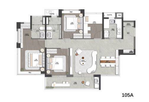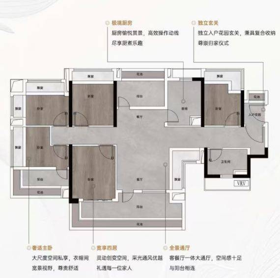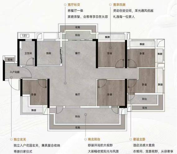 建面约115-127㎡南北对流四房:这类户型做到了四开间甚至4.5开间朝南,南北通透,空气对流顺畅。宽阳台设计结合花池赠送,极大地拓展了生活空间。部分户型更拥有双阳台设计,超宽客厅与景观阳台相得益彰,尽显豪宅气度。