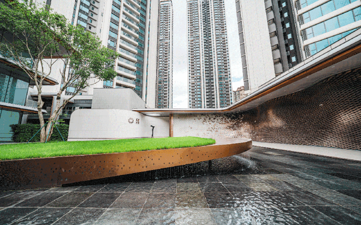 主入口的后面,做了双层叠水景观,千片“龙鳞”打造的金属景墙,充分利用光源增加门头质感,在视觉上就显得更加高级。
