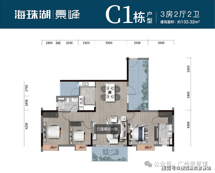 133方户型三房两卫,适合改善人群。四开间朝南飞机户型,阳台与房间景观看小区花园。这个户型比较有特色的是有12方的入户花园,加上生活阳台与景观阳台,在目前的新房市场来说三者皆有的户型属于珍稀房源。