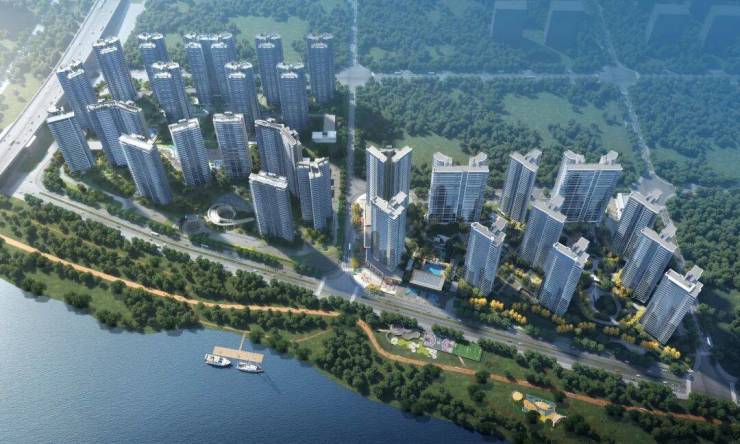 环抱式亲江布局 地势抬高 3 米实现户户朝南 江景环绕在家也坐拥 270° 无边界巨幕江景