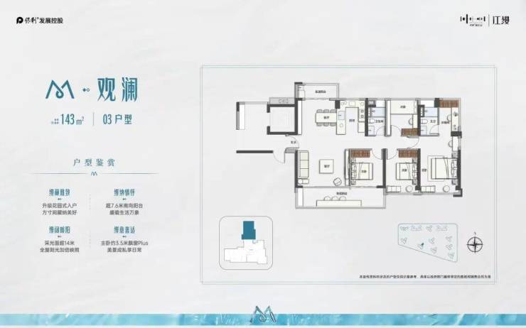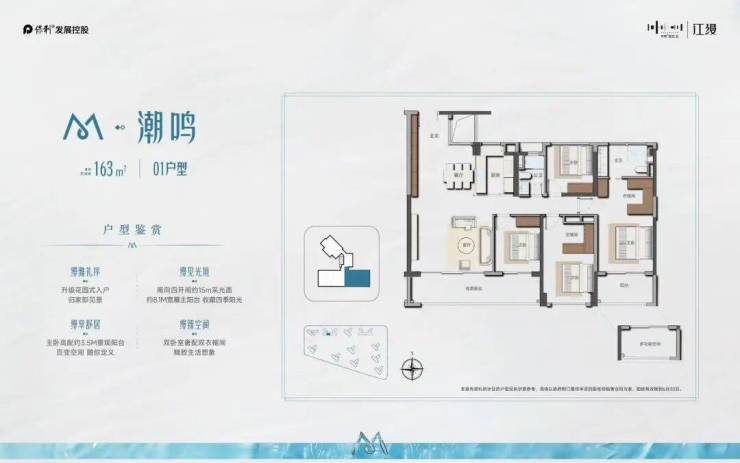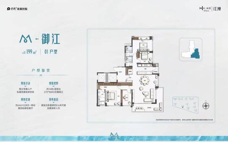 约8.1m宽幕主阳台,内可望园景 外可望江景+城景南向四开间约15.8m+主卧约4.4M观景阳台
