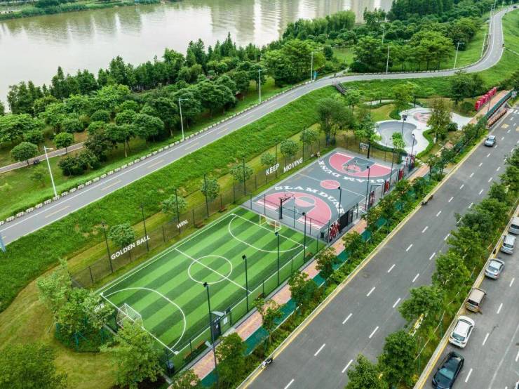 项目自建约5900方江边体育公园,内设5人标准足球场、全场篮球场、滑板场、一米社区农场等特色场所,满足全方位运动与娱乐需求