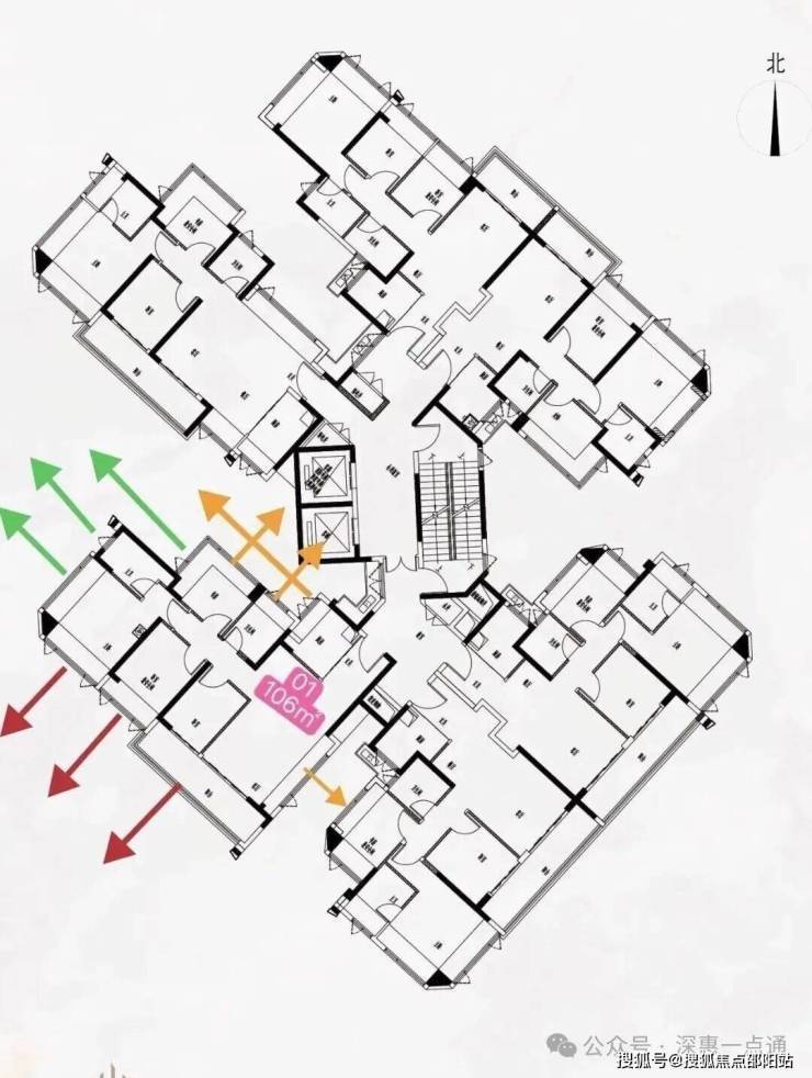 最后再来说一下黄色箭头情况这里是比较需要注意的点这里可以看一下这个楼栋平面图,其中书房次飘窗,客厅卫生间看出去是天井墙体,所以书房做了是双面采光这里还好,卫生间可能影响一点,客厅飘窗也会有跟06户型88平米的书房对视遮挡问题,这里后续可以通过其他问题解决