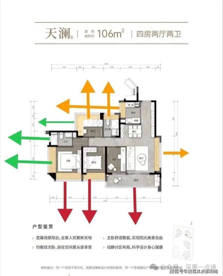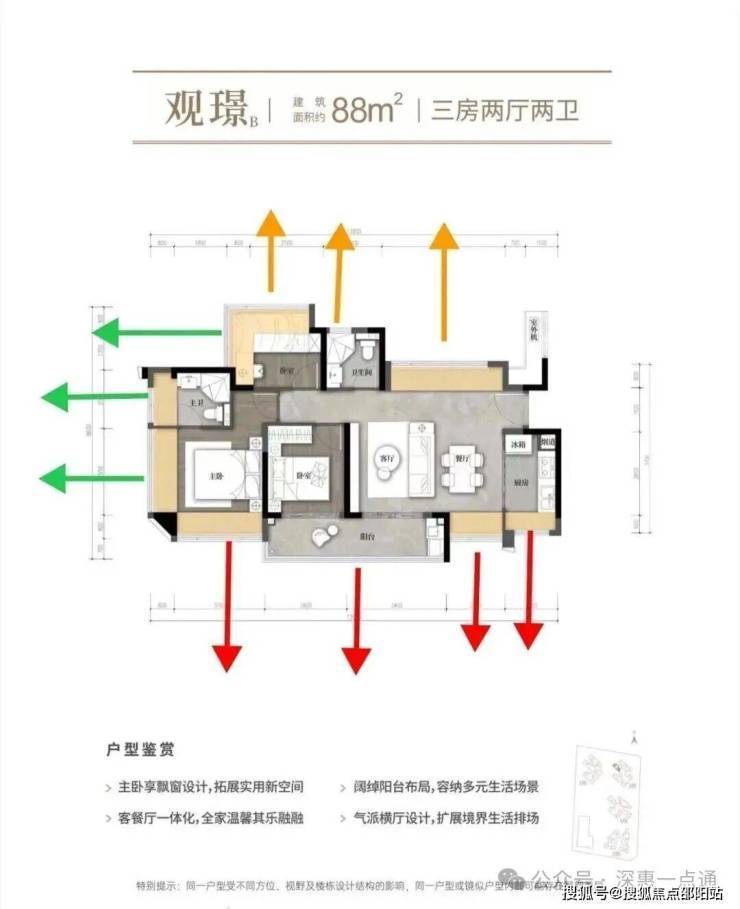 这里先分析一下02的88横厅情况,88横厅红色箭头阳台,次卧,主卧西南朝向其实也是跟106一样,会夹在中间,而且这个更严重,左侧被自己的107遮挡,右侧是1栋,相比106来说88横厅这里视野更差一些,这个户型唯一优势在于格局以及使用率会比竖厅的88好