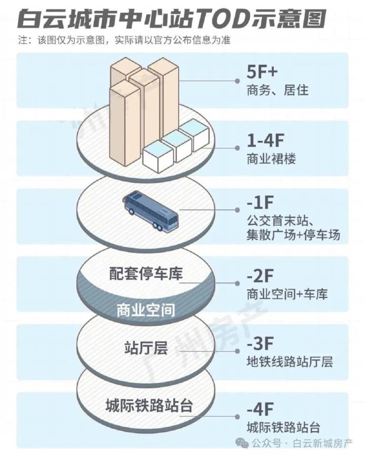 约7万㎡的白云城市中心站场综合体,整个站场以垂直立体式的TOD模式打造,涵盖地下商业空间、停车场、公交车首末站、集散广场,以及多层的商业裙楼。