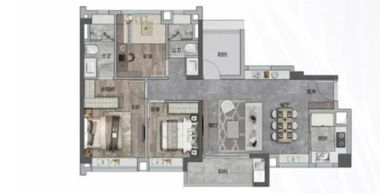 建面约114㎡户型与85㎡户型有异曲同工之妙,同样横厅设计,客餐厅的部分增加一扇满屏飘窗,采光再次拉满。所有房间包括两个卫生间均带飘窗,既美观又增加了床铺和收纳空间,主卧还带步入式衣帽间。