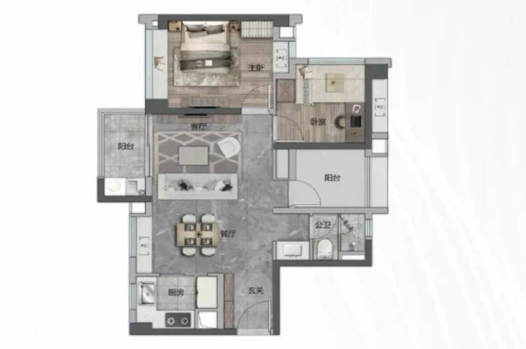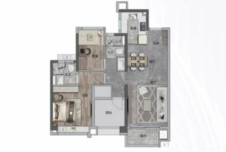 可以看到客餐厅和主卧面积都比较阔绰,就厨房和阳台偏小,那这个思路其实是对的,因为年轻人在家更多是呆在客厅或者自己房间,所以保证这两个空间的舒适度是最重要的。