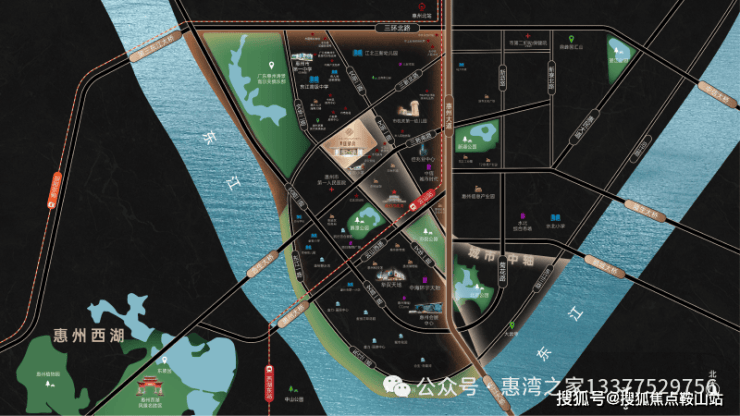 中盛遂晴府位于惠城江北菊花头片区,临东江,距华贸天地约 1.2km,地处江北文华一路边上,处于惠州江北 CBD 核心地段。周边生活配套异常完善,一路之隔有富民小学,直线 1 公里范围内还有惠州一中江北校区、东江高级中学、金裕小学等多所学校,能满足孩子全龄段的教育需求。佳兆业中心、市图书馆、市民公园等配套设施也皆在周边,居民吃喝玩乐购一应俱全。此外,项目紧邻三新北路主干道,交通出行十分便利。可以说,该楼盘占据了城市核心地段的区位优势,无论是生活氛围还是发展潜力都十分可观。