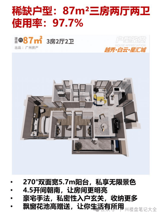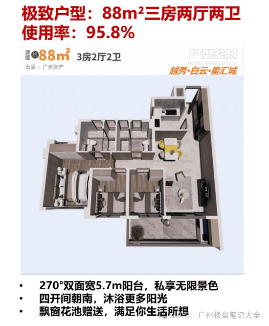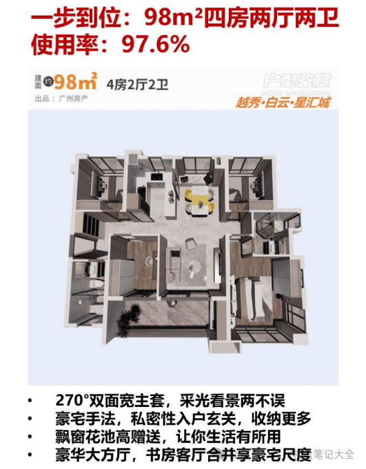 卖点二、【最强销量】:连续蝉联白云销冠,买房跟大众准没错!连续 8 个月蝉联白云销冠,1 个月蝉联广州销冠,23 年上半年白云销冠,大众的眼睛是雪亮的,买销冠盘总没错。