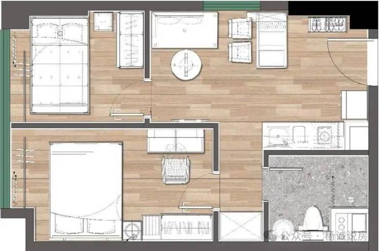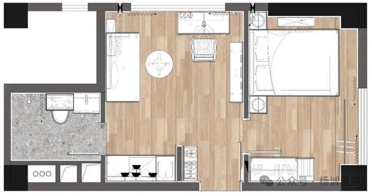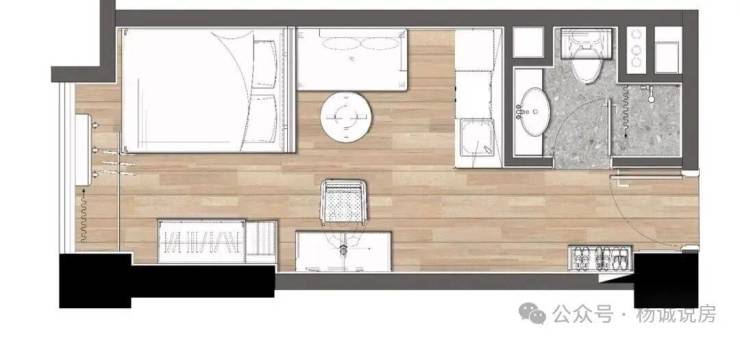 一室一厅提供两种配置选择:一为标准版,二为在标准版基础上,增加了独立书房与步入式衣帽间的升级版。