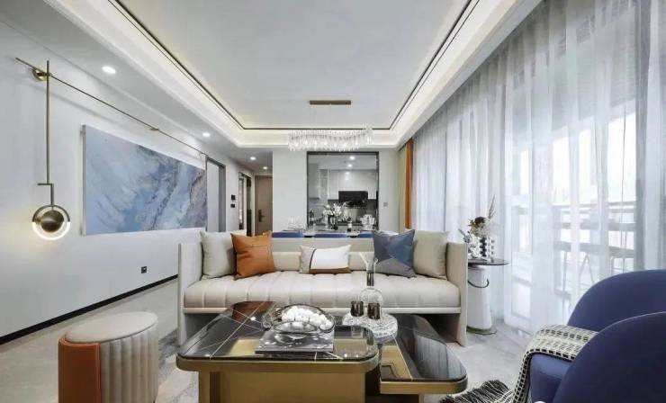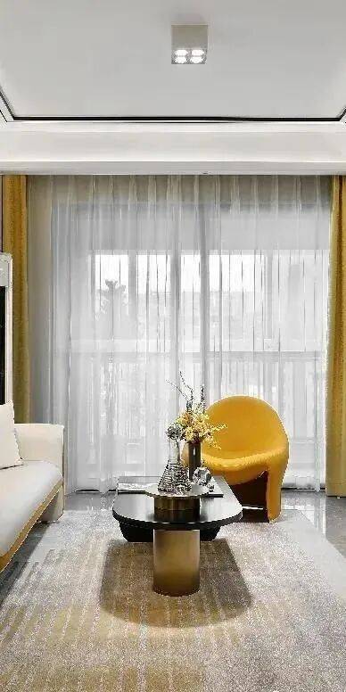 客厅开间约为 3.5 米,进深约 3.3 米,层高大约3米,客厅连通阳台与餐厅方向,在通风和采光方面俱佳,实现真正的通风南北对流。