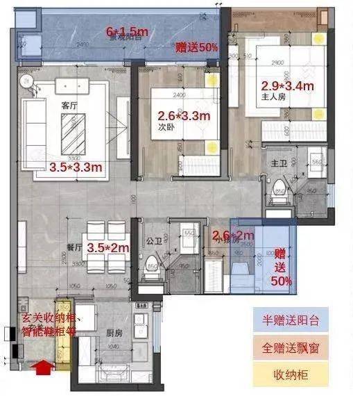 建面约98㎡的户型是西北向,约6米超宽阳台可以远望一线江景,再加上河涌景、江岸公园景观,更加突显大阳台的生活品质享受,而且大开间阳台还可以增强全屋的通风采光效果,让生活更具舒适感。