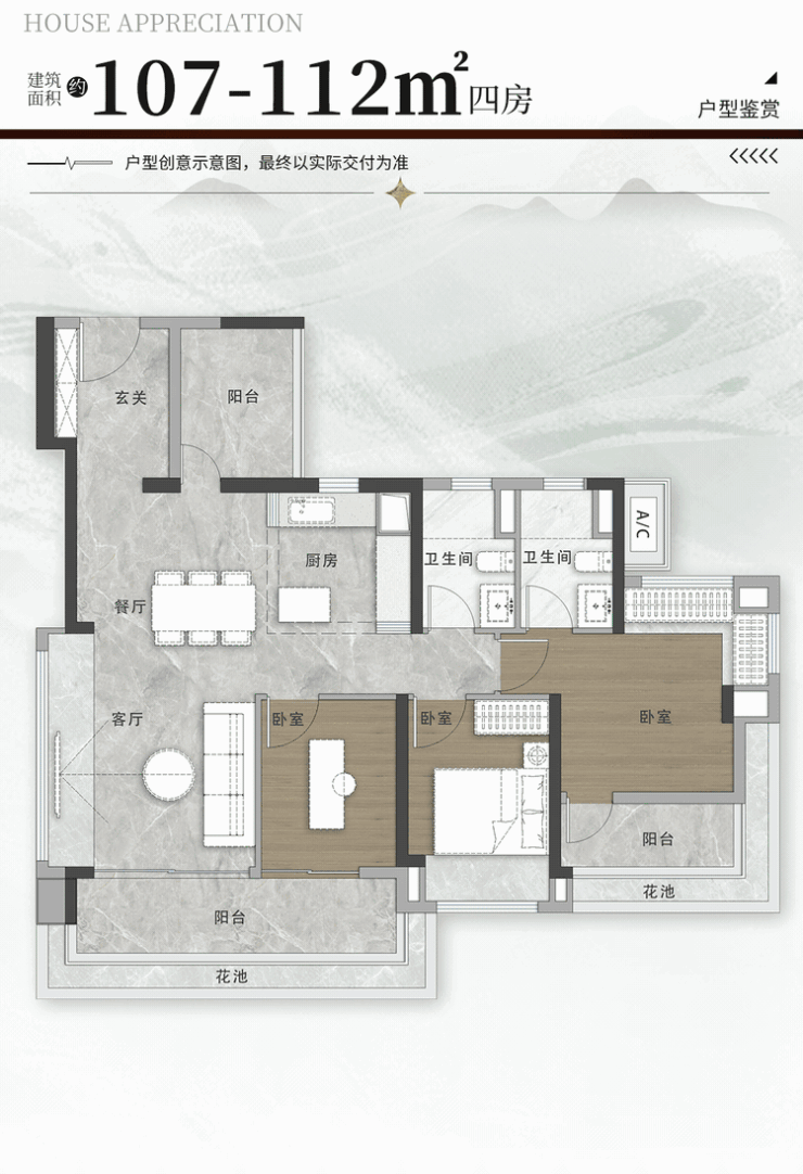建面约107-112㎡的四房,是项目的四房起步户型。
