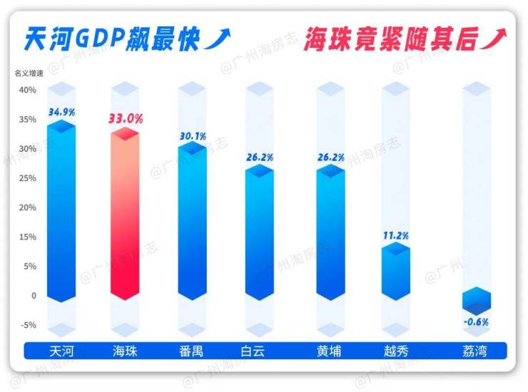 其次,从经济潜力来看,翻看近五年GDP增速,海珠以33%的成绩紧随天河其后,二者飙得相当接近。