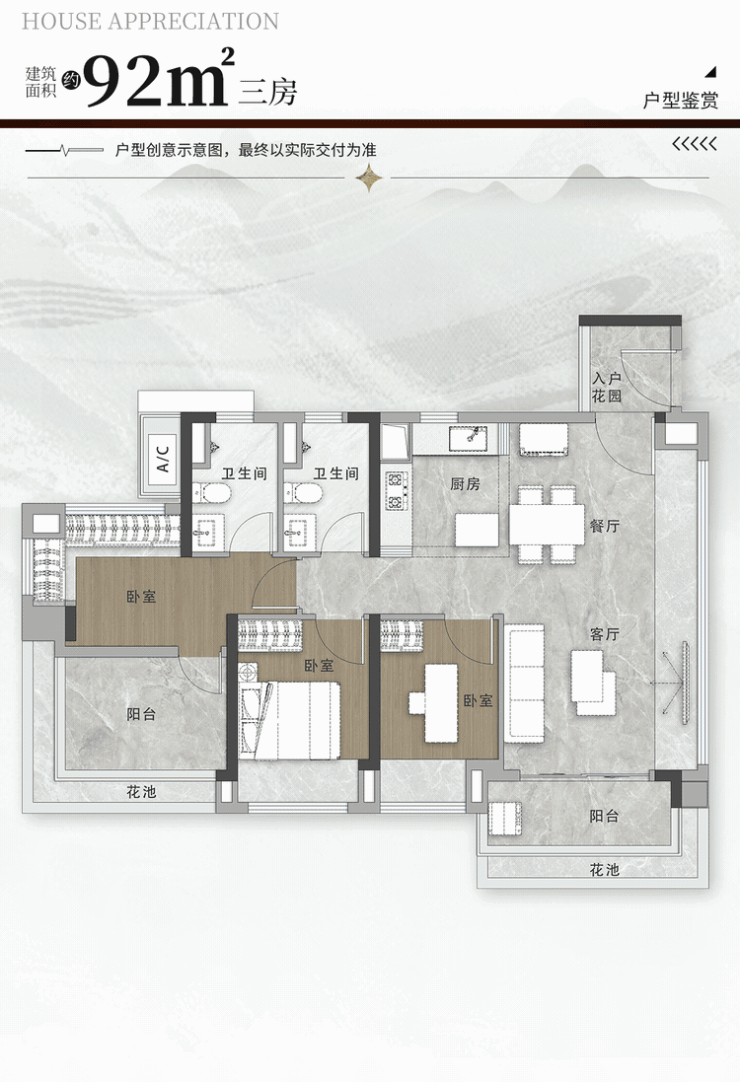 建面约92㎡的竖厅三房,则为竖厅设计,侧面飘窗设计大大拓宽了原有的面宽。