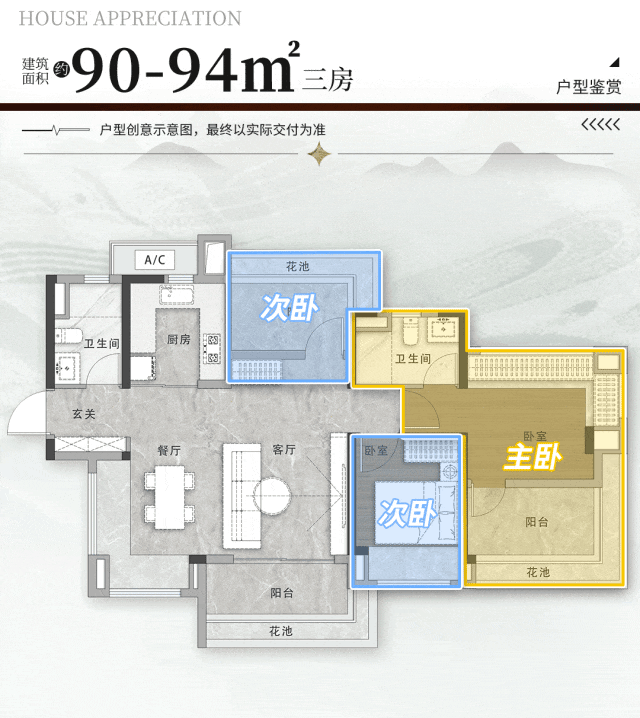 建面约90-94㎡的三房,拥有一个霸屏式横厅,超聚厅面宽最高接近6米。
