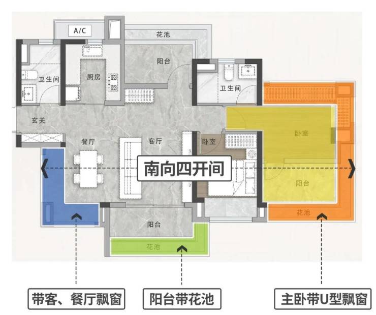 创新性!第一个全户型客、餐厅均带飘窗,超级主套带U型飘窗的住宅。
