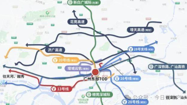 【新塘TOD】作为广州东部(新塘)交通枢纽中心,以新塘站为中心,汇聚2城轨(穗莞深及新白广城际轨道)、3高铁(广深、广汕、京九)、5地铁(广州地铁13号线、16号线、20号线、28号线、28号线支线),十轨交汇,一体交通网络快速通达广深莞。