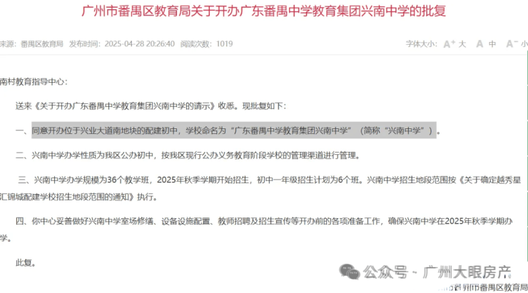 4月28日晚,广州市番禺区教育局发布公告,同意开办位于兴业大道南地块的配建初中,学校命名为“广东番禺中学教育集团兴南中学”(简称“兴南中学”)。