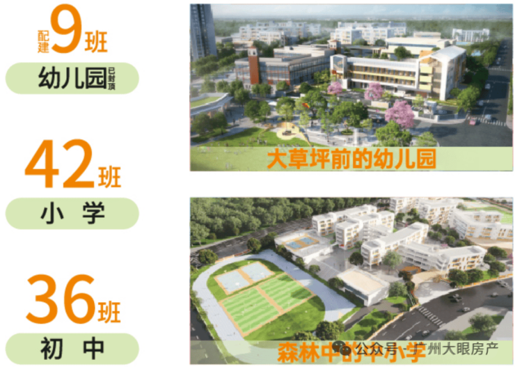 该项目配备了一所9班规模的幼儿园,以及42班小学和36班初中,总计提供3600个学位,数量甚至超过了业主户数(2577户)。