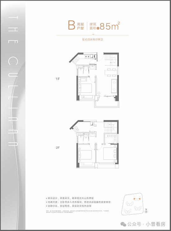总建筑面积约10.6万㎡,设有4栋高层复式洋房,建面为85-120㎡,采用错式排布,全南向设计,通风采光俱佳,带精装交楼。