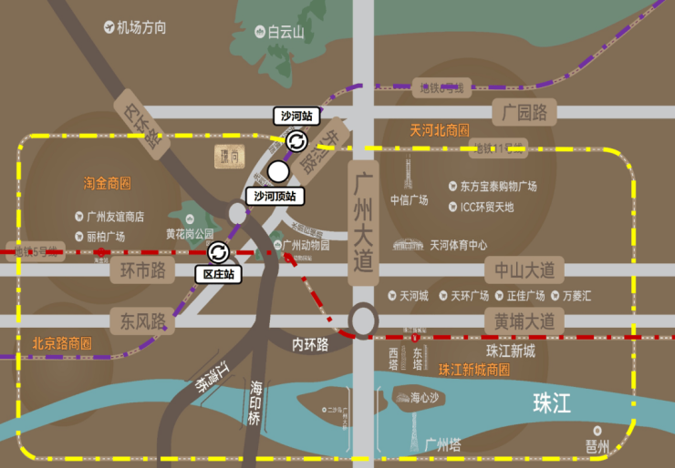 20分钟内可抵达环市东、珠江新城、北京路、白云新城等主轴商圈,周边环伺太古汇、万菱汇、正佳广场、天河城购物中心、ICC环贸天地等大型综合商业,满足多元消费需求。